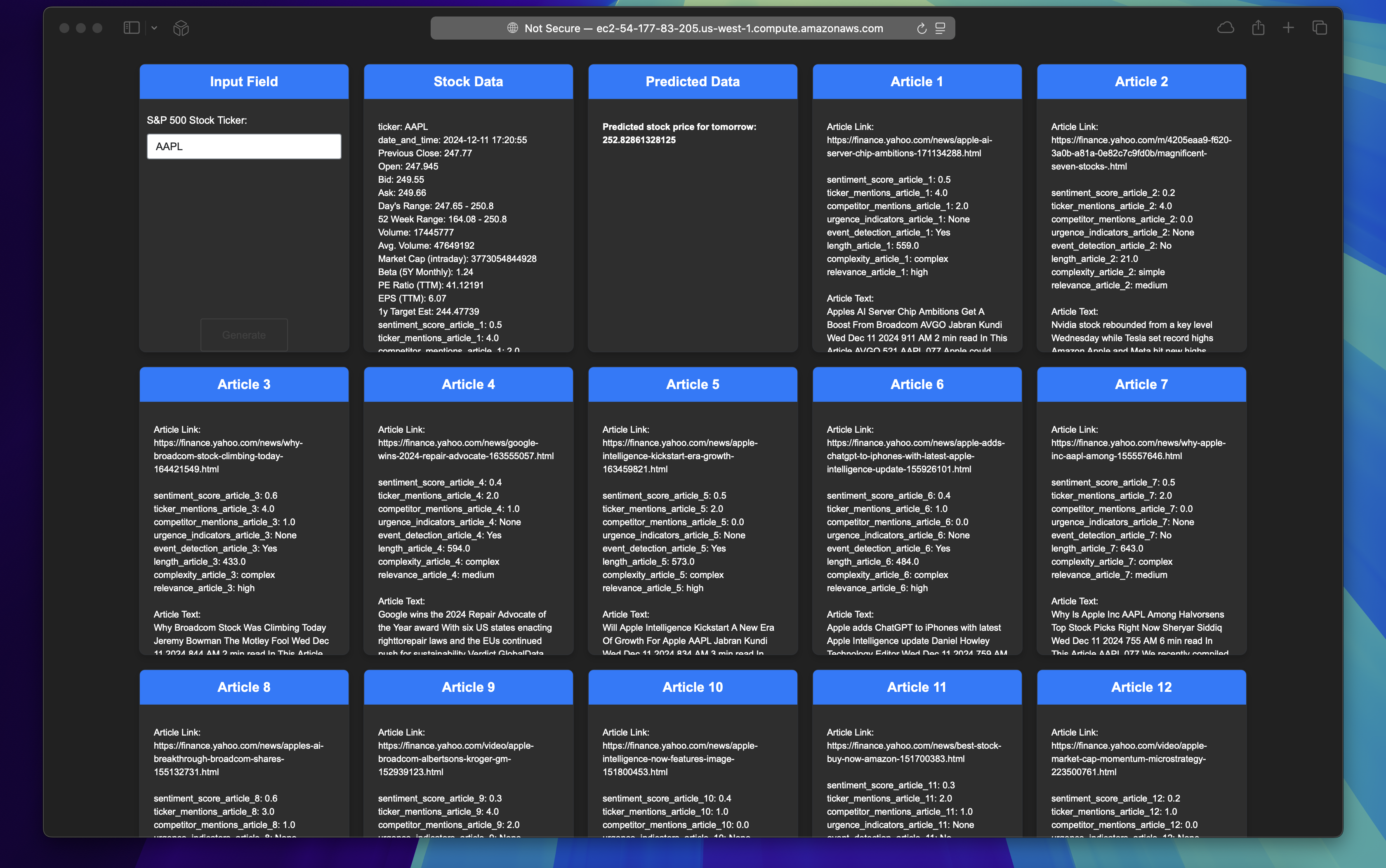 I developed a machine learning pipeline for stock price prediction, fully deployed on AWS EC2 for scalable and low-latency performance. It automates financial news scraping with Selenium and BeautifulSoup, transforms unstructured data into actionable features using ChatGPT's NLP capabilities, and integrates these insights with historical data to predict next-day closing prices. An interactive Python Shiny dashboard provides a user-friendly interface for analyzing predictions and article insights.
